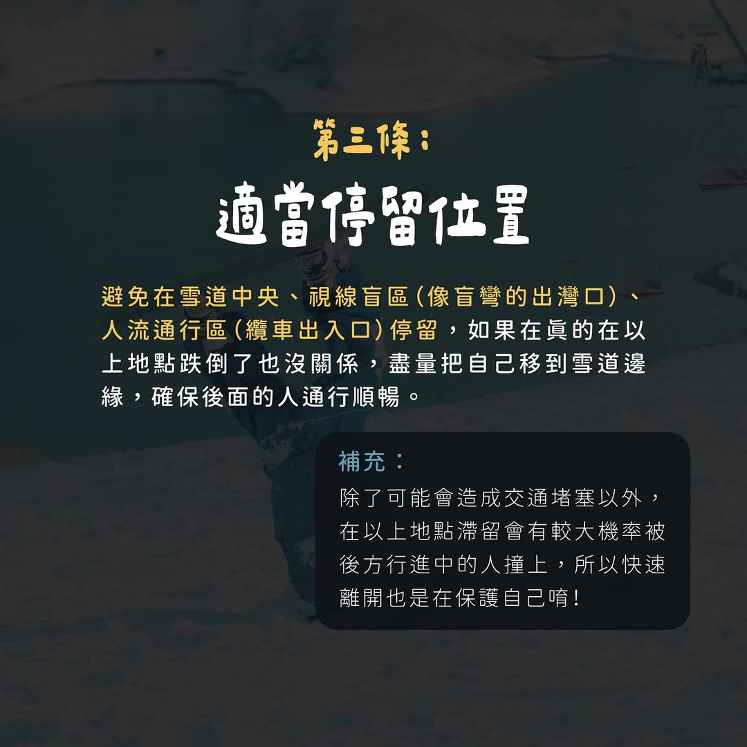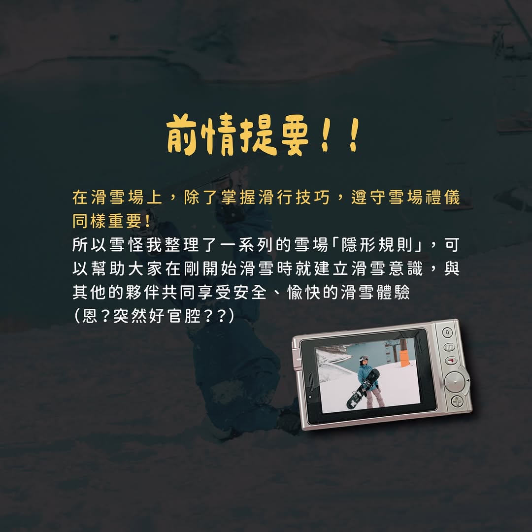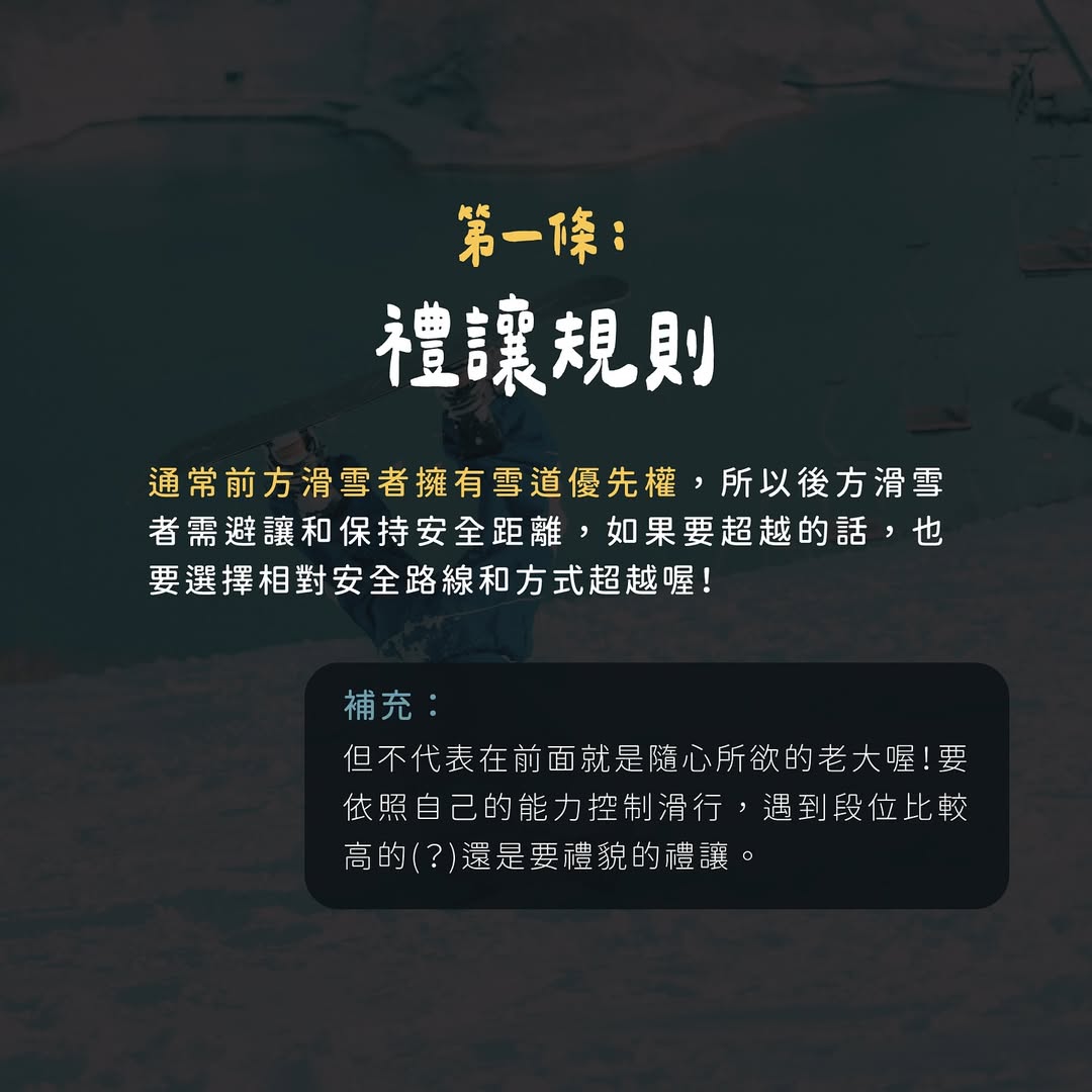 其實!會說是隱形規則就是因為它「並非明文規定」,而是透過大家共同遵守或維持以享有「安全」的一種默契,大家來滑雪玩得開心,也要安全第一!所以今天雪怪來分享幾個覺得很重要的小眉角,希望大家都有認真看完喔😝✨